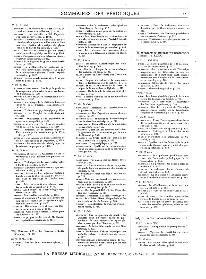 1930, Sommaires des périodiques. -