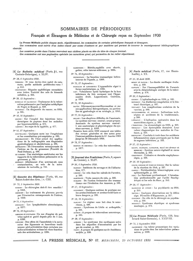 1930, Sommaires des périodiques. -