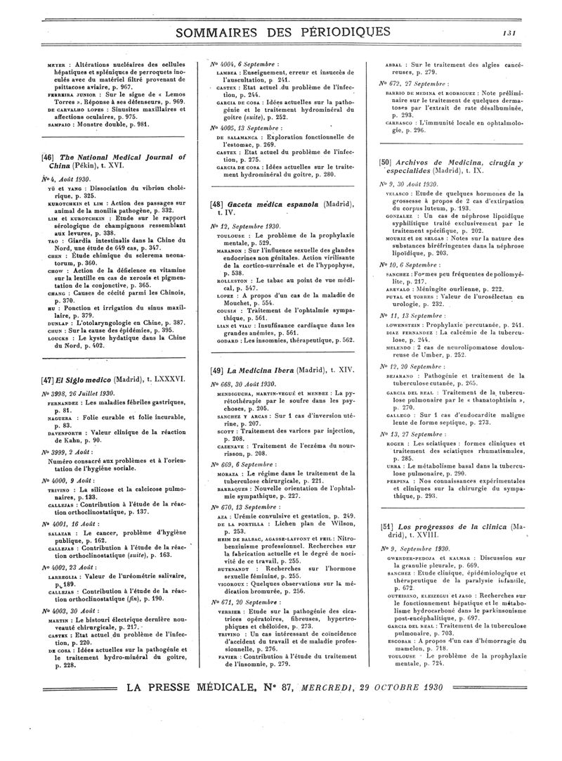 1930, Sommaires des périodiques. -