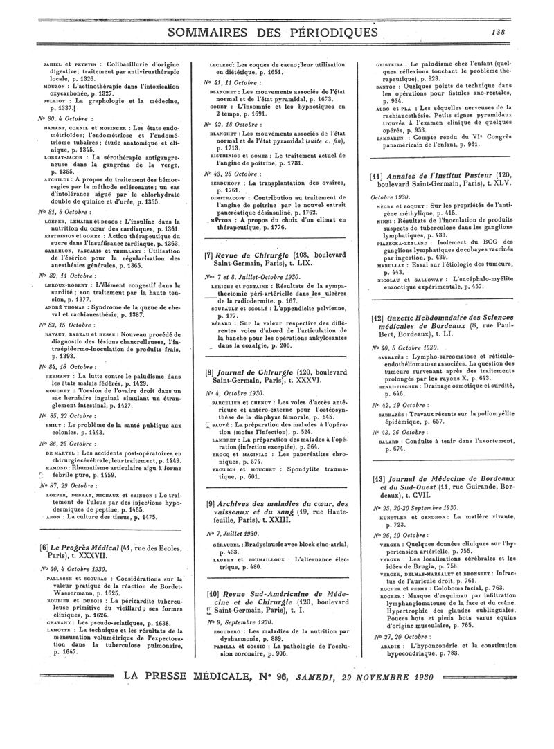 1930, Sommaires des périodiques. -