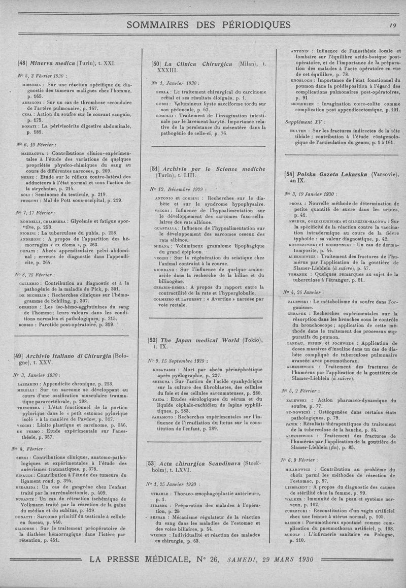 1930, Sommaires des périodiques. -