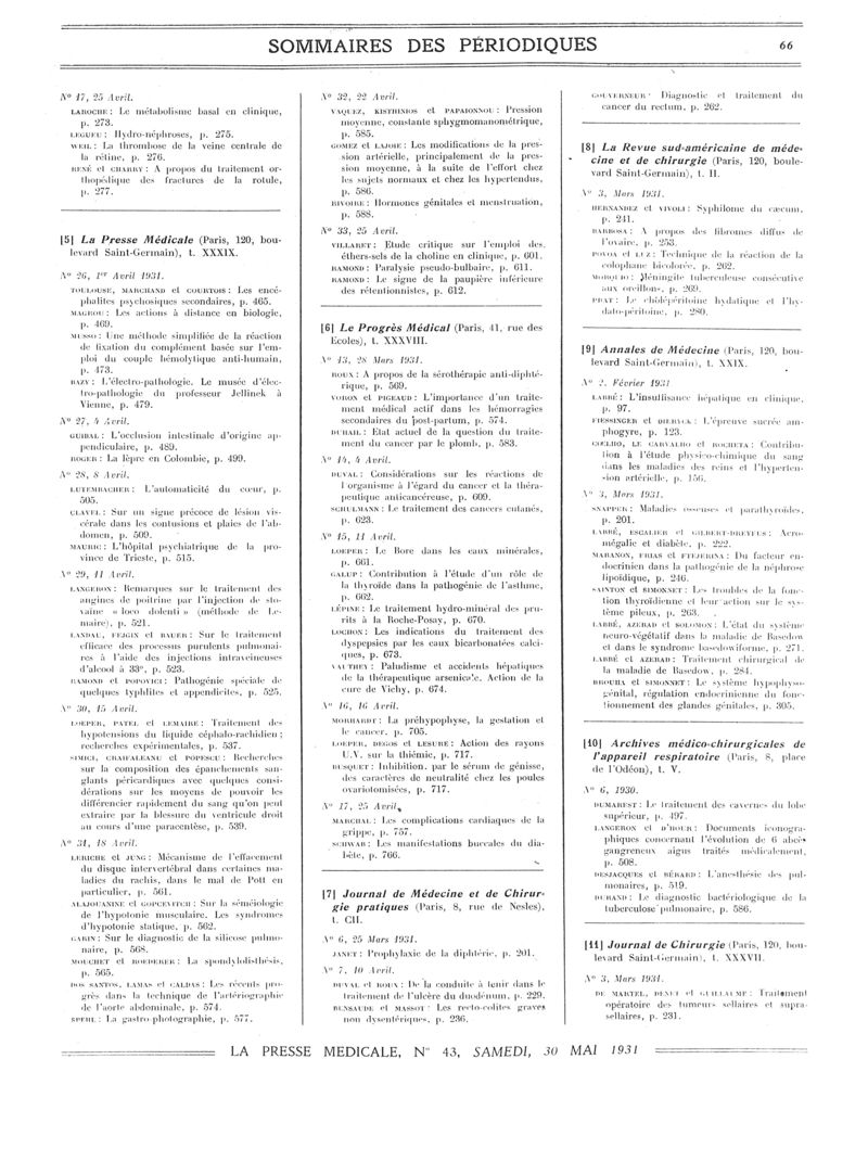 1931, Sommaires des périodiques. -