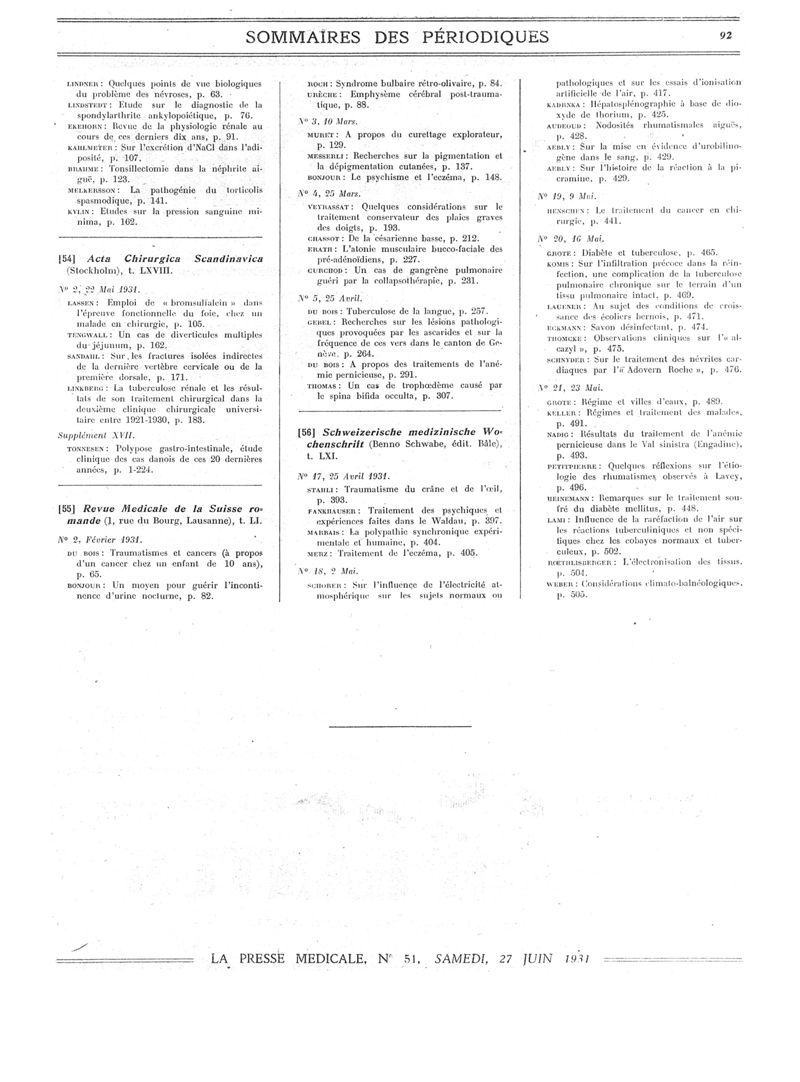 1931, Sommaires des périodiques. -