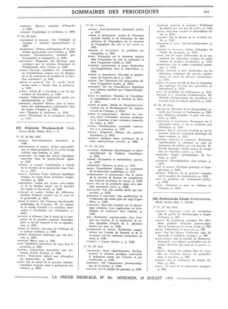 1931, Sommaires des périodiques. -