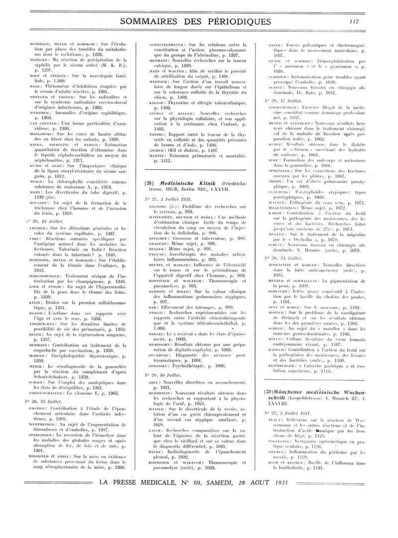1931, Sommaires des périodiques. -
