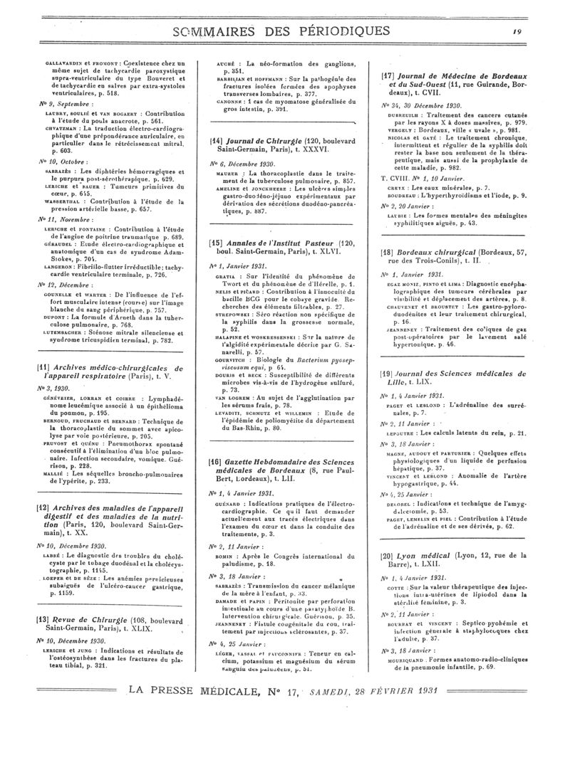 1931, Sommaires des périodiques. -
