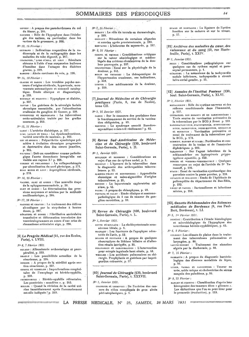 1931, Sommaires des périodiques. -