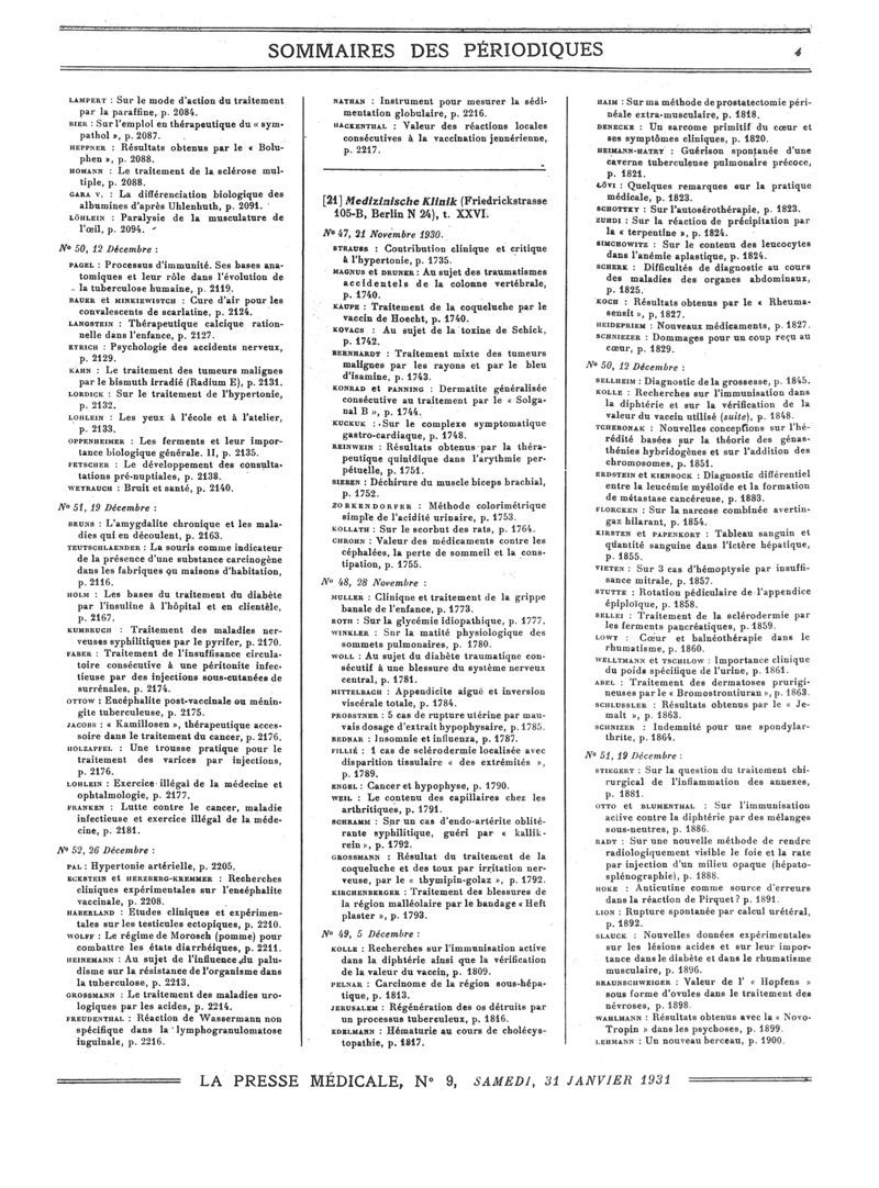 1931, Sommaires des périodiques. -