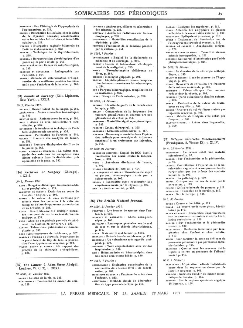 1931, Sommaires des périodiques. -
