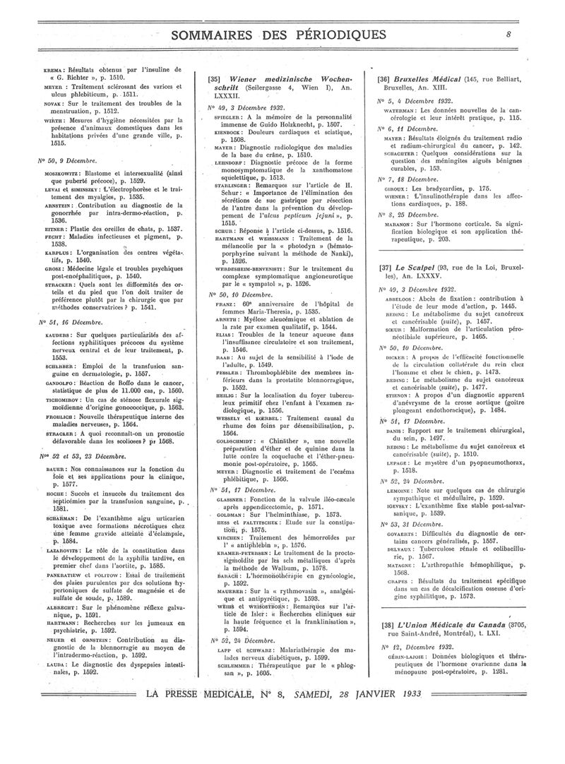 1933, Sommaires des périodiques. -