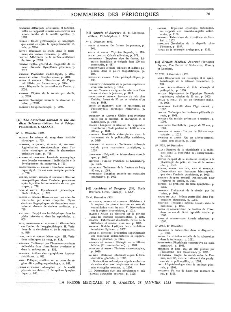 1933, Sommaires des périodiques. -