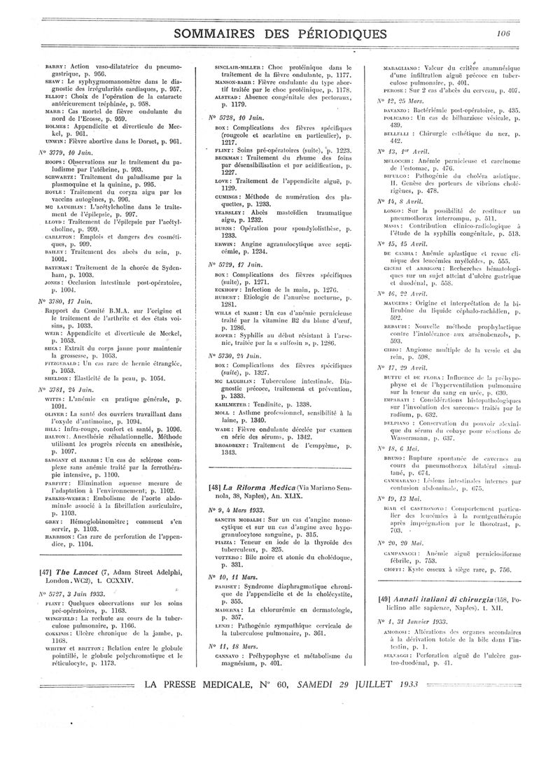 1933, Sommaires des périodiques. -