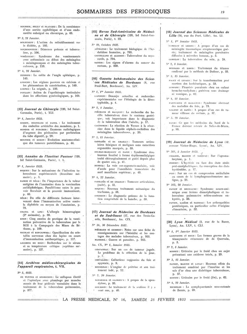 1933, Sommaires des périodiques. -