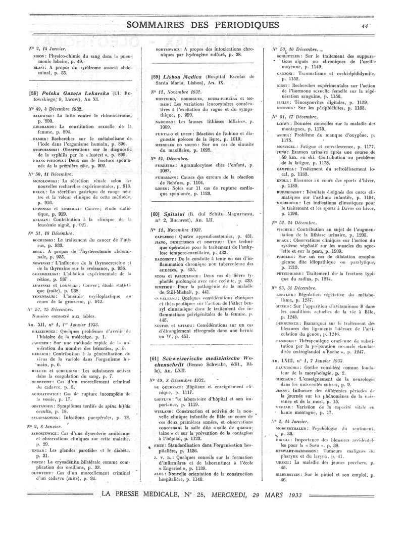 1933, Sommaires des périodiques. -