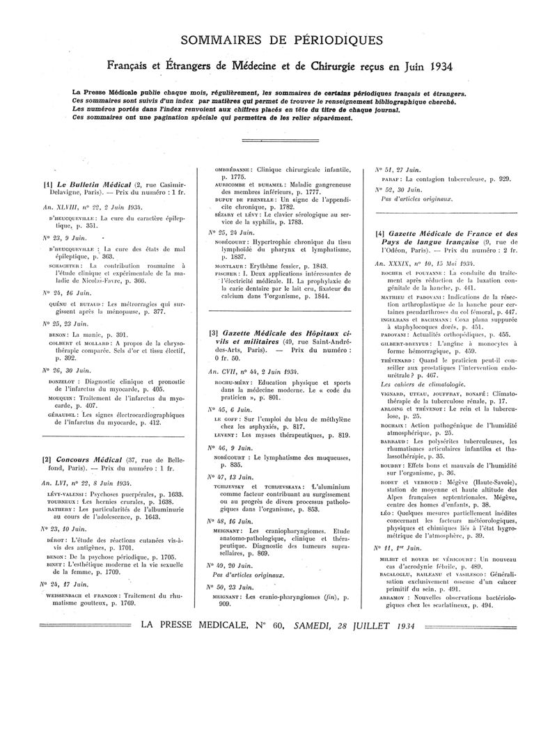 1934, Sommaires des périodiques. -