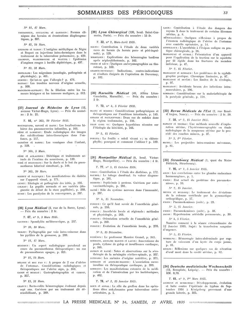 1935, Sommaires des périodiques. -