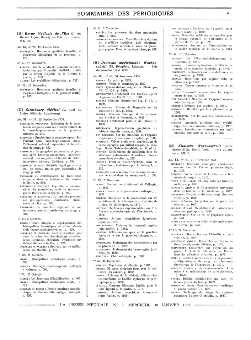 1935, Sommaires des périodiques. -