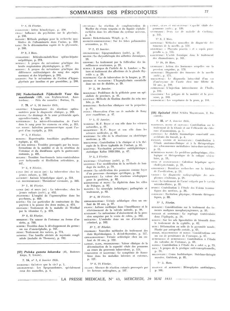 1935, Sommaires des périodiques. -
