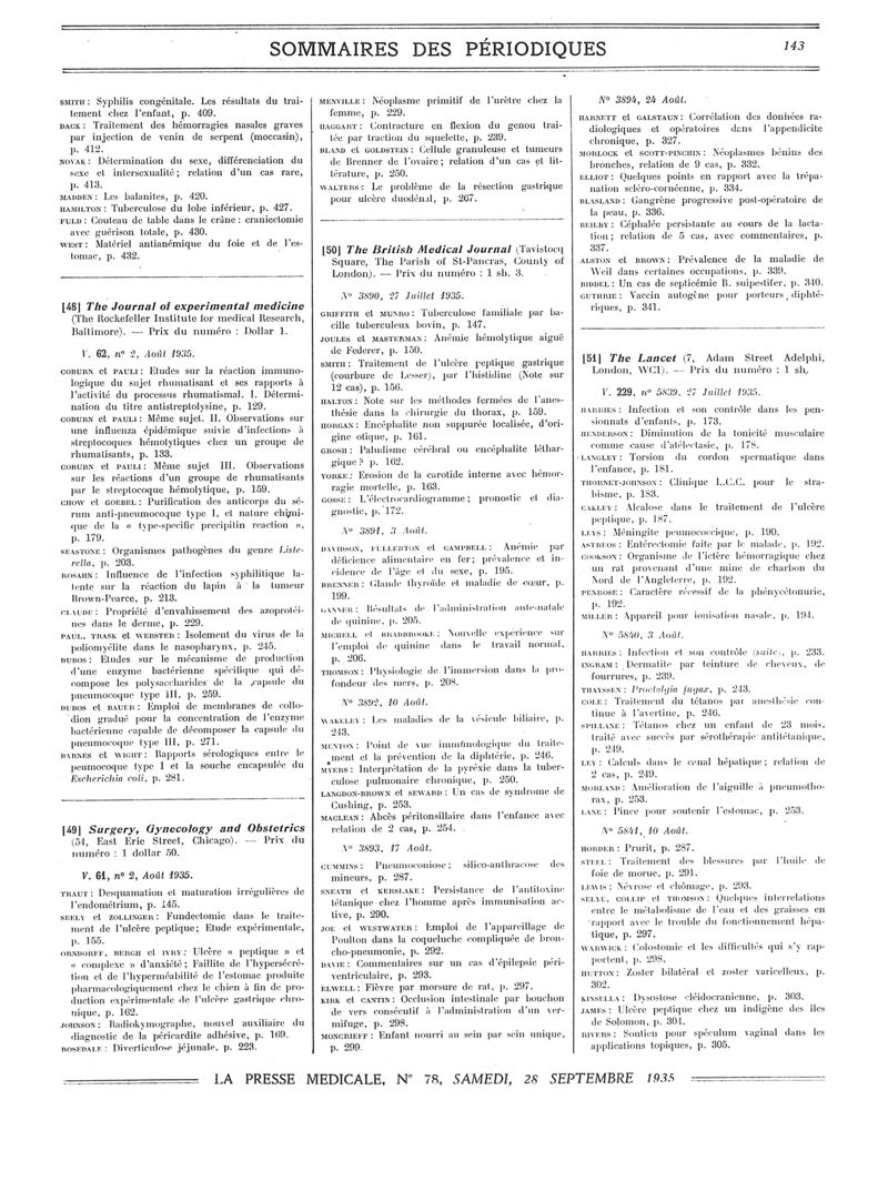 1935, Sommaires des périodiques. -