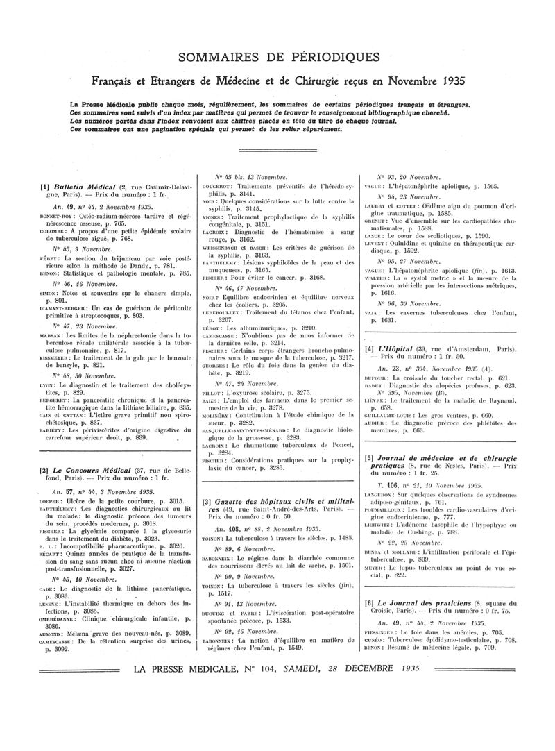 1935, Sommaires des périodiques. -