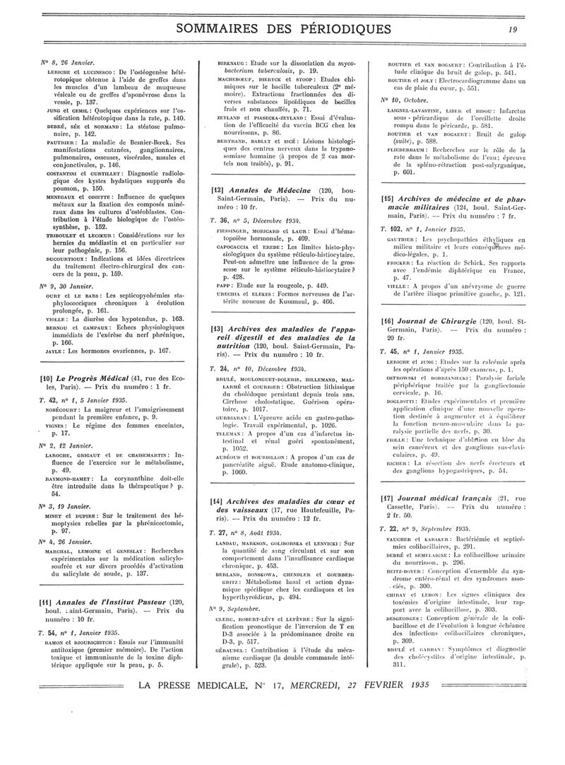 1935, Sommaires des périodiques. -