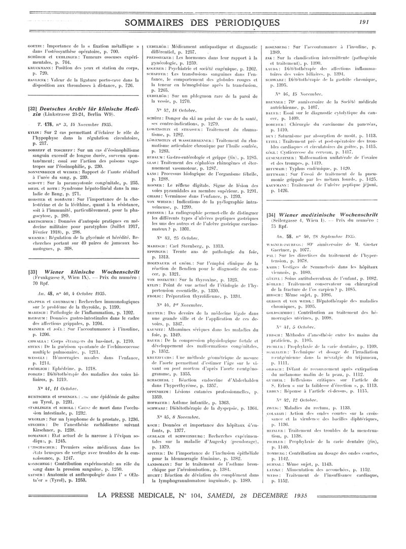 1935, Sommaires des périodiques. -