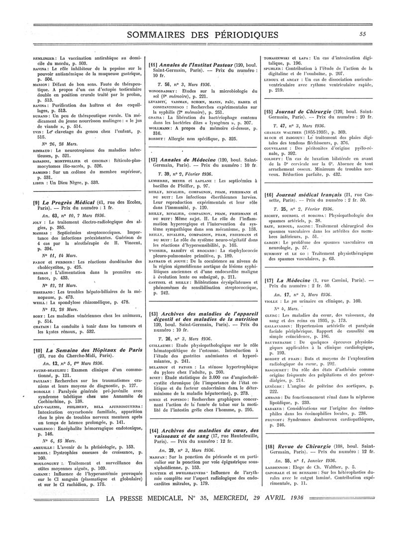 1936, Sommaires des périodiques. -