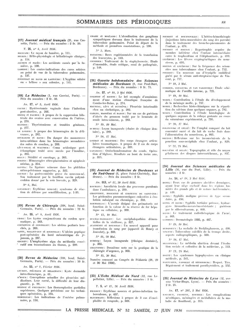 1936, Sommaires des périodiques. -