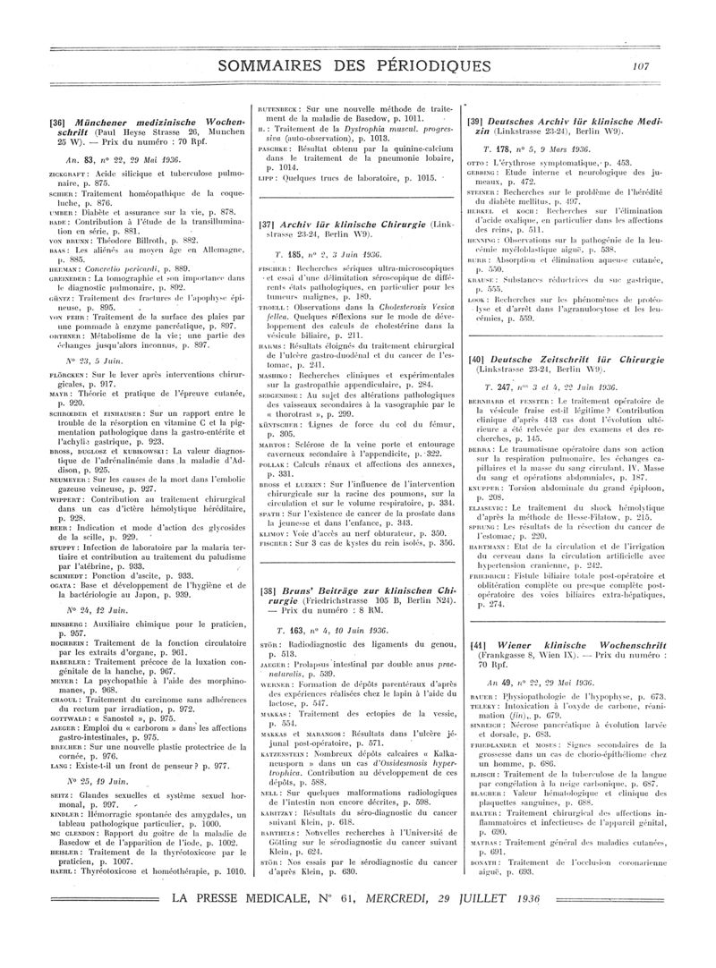 1936, Sommaires des périodiques. -