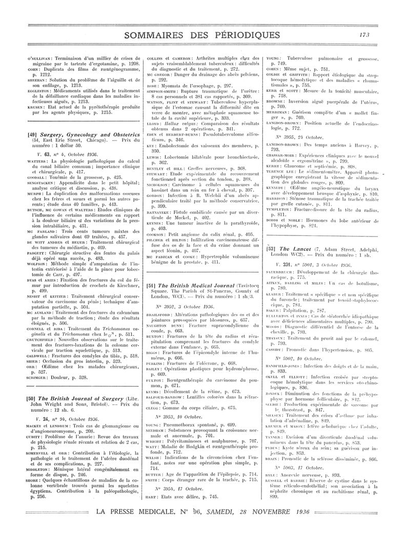 1936, Sommaires des périodiques. -