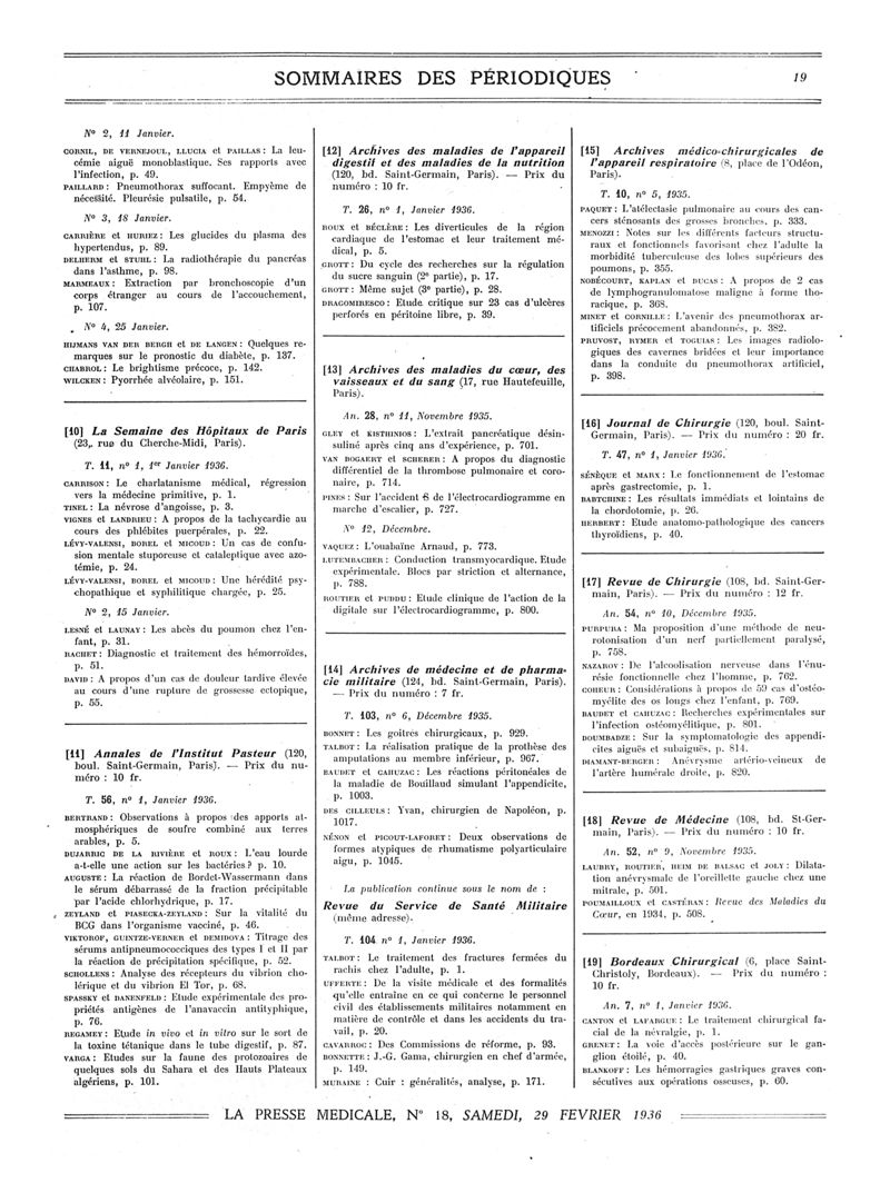 1936, Sommaires des périodiques. -