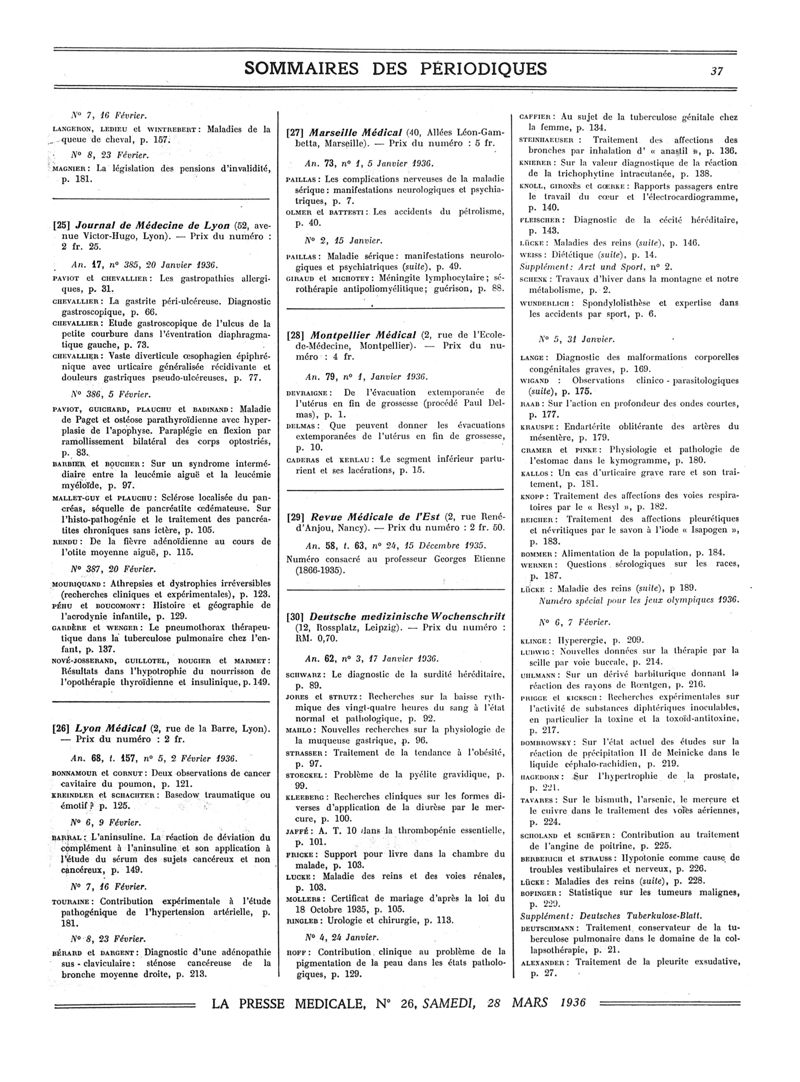 1936, Sommaires des périodiques. -