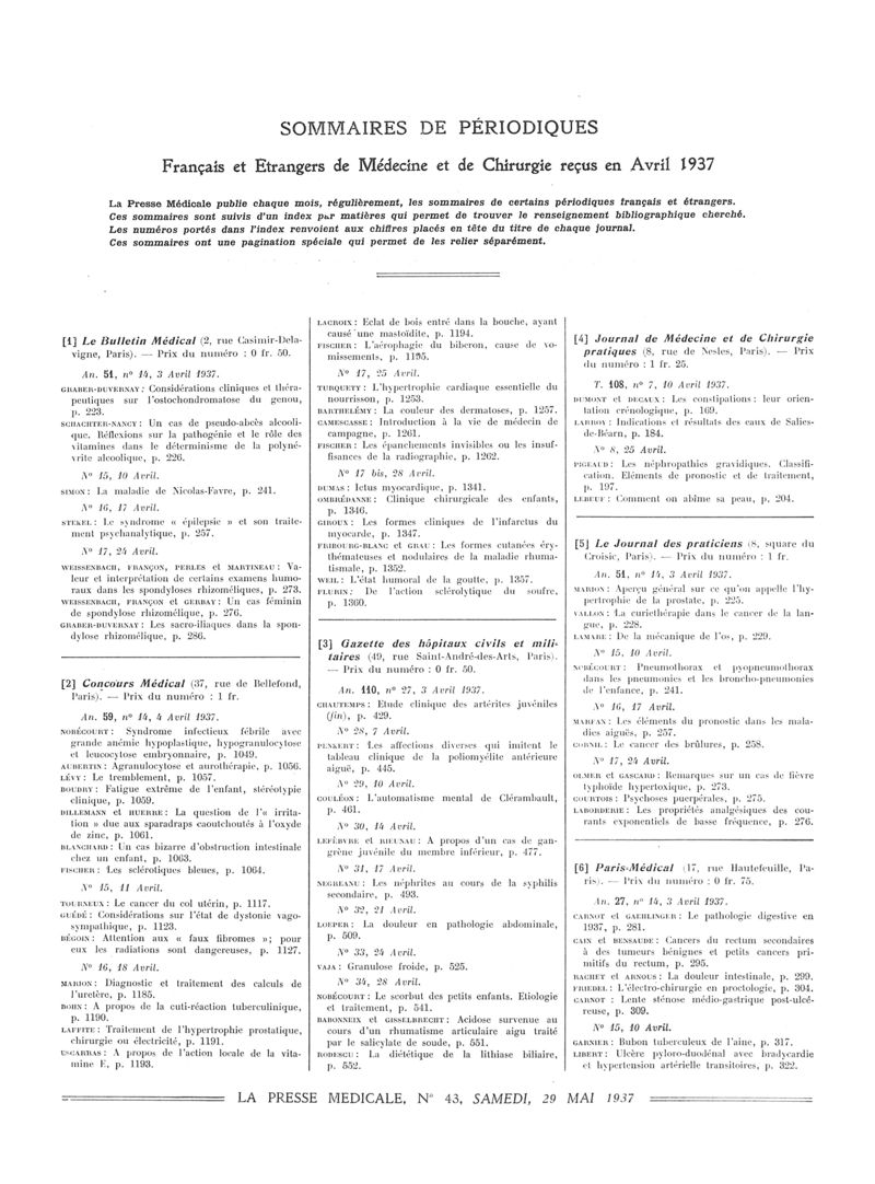 1937, Sommaires des périodiques. -