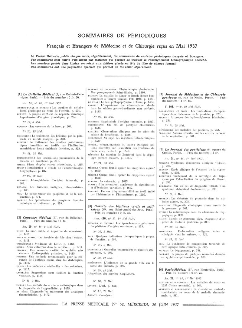 1937, Sommaires des périodiques. -