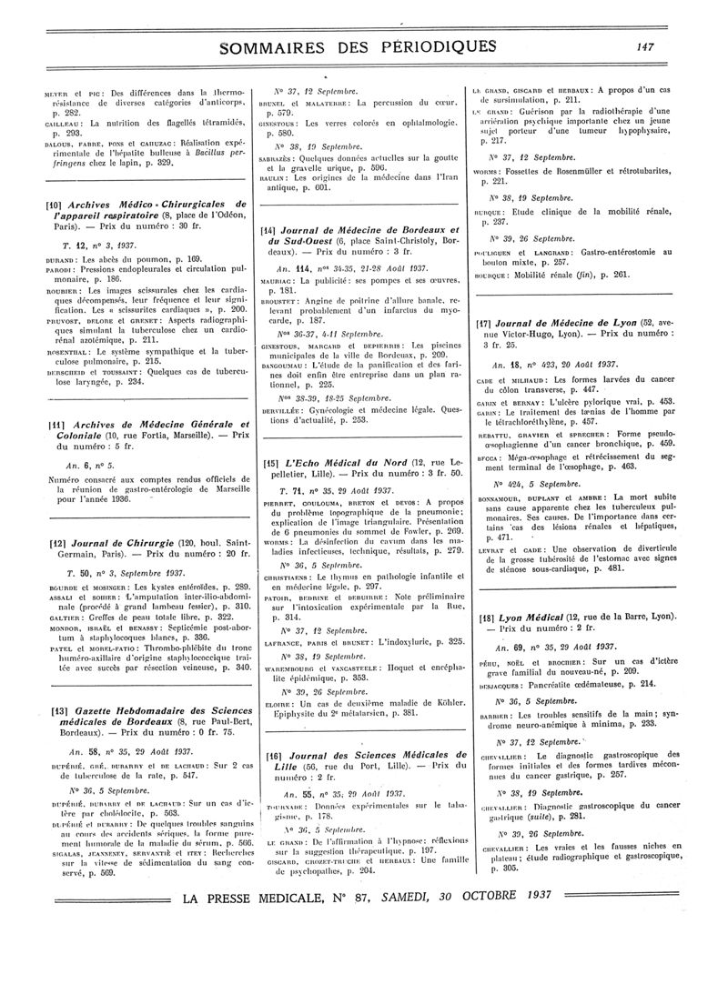 1937, Sommaires des périodiques. -