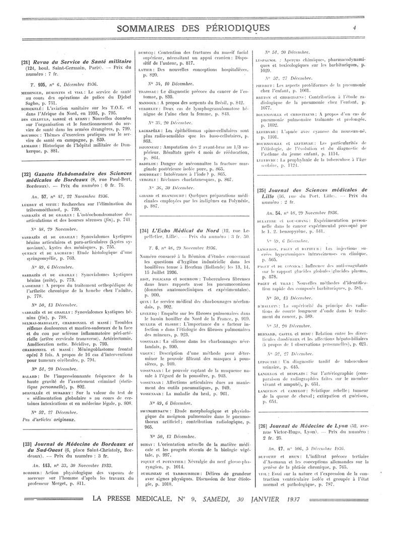 1937, Sommaires des périodiques. -