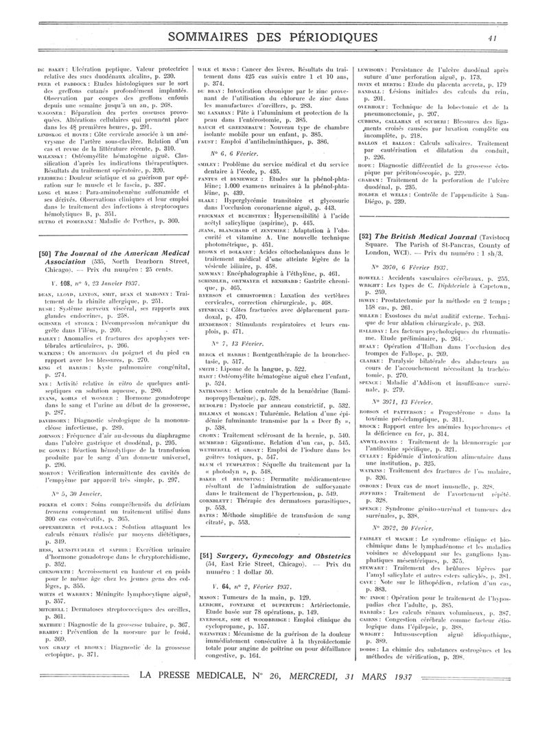 1937, Sommaires des périodiques. -