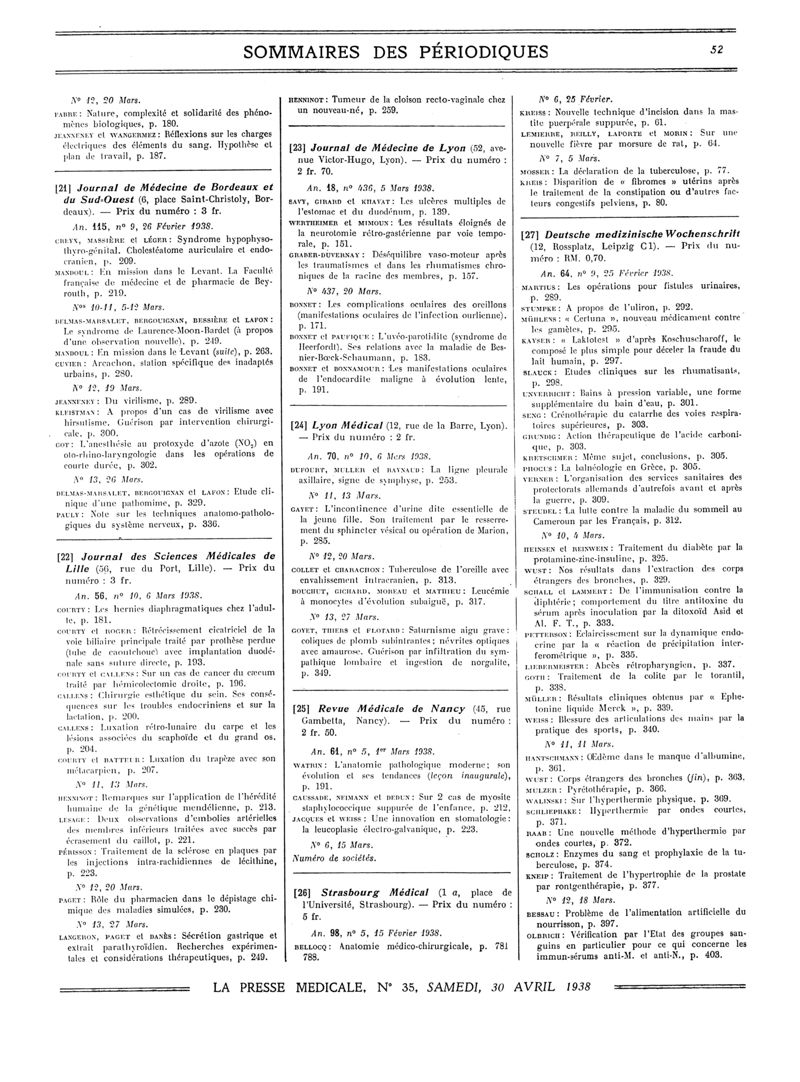 1938, Sommaires des périodiques. -