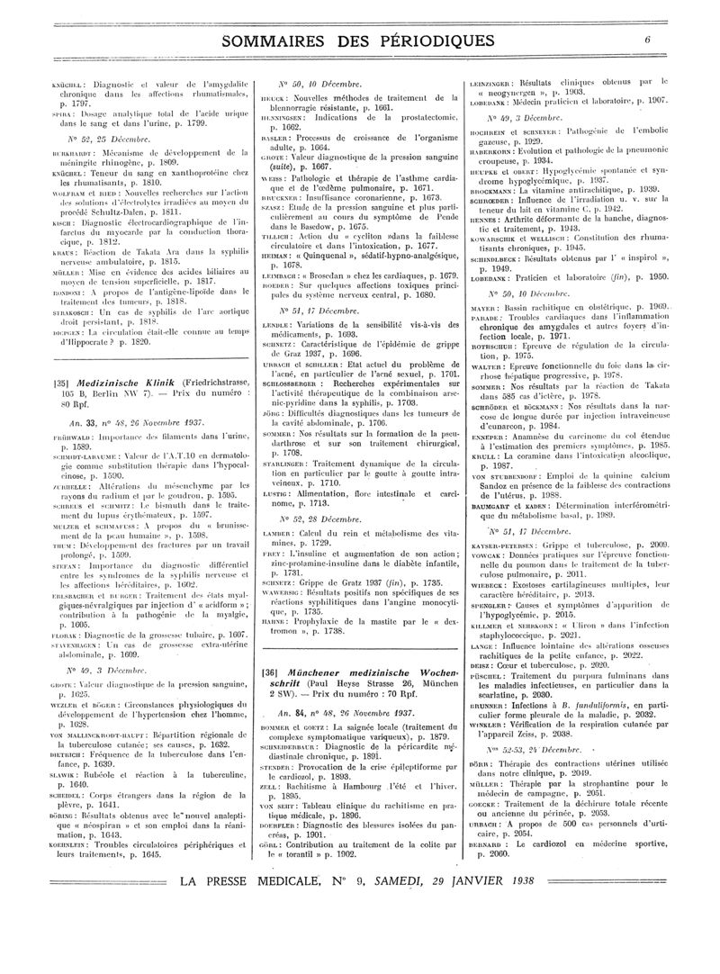 1938, Sommaires des périodiques. -