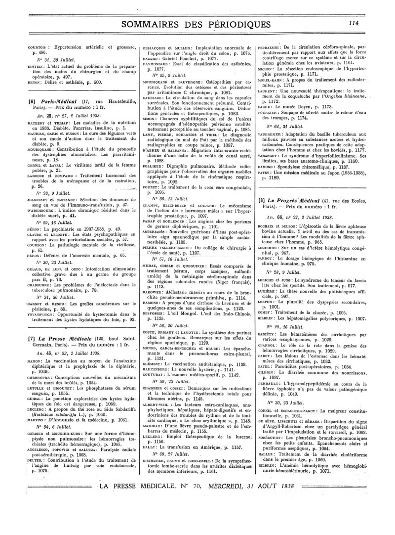 1938, Sommaires des périodiques. -