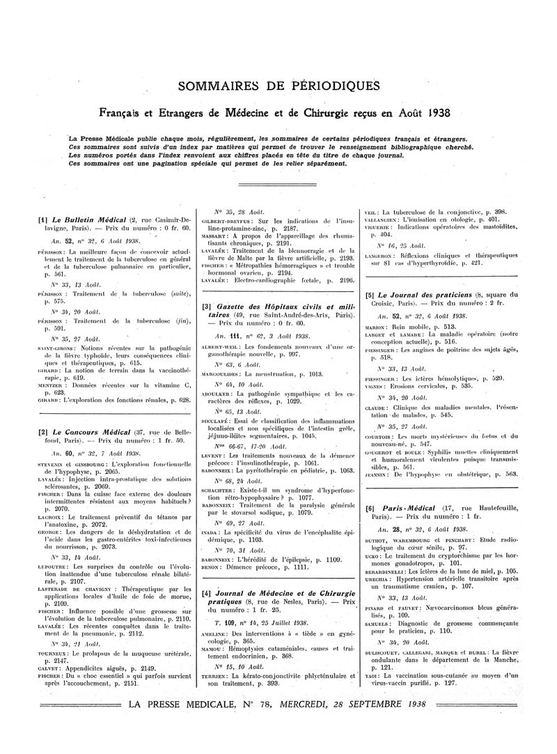 1938, Sommaires des périodiques. -