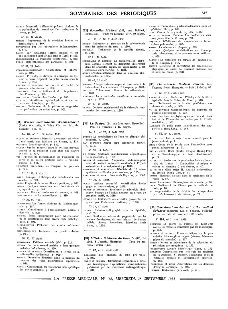 1938, Sommaires des périodiques. -