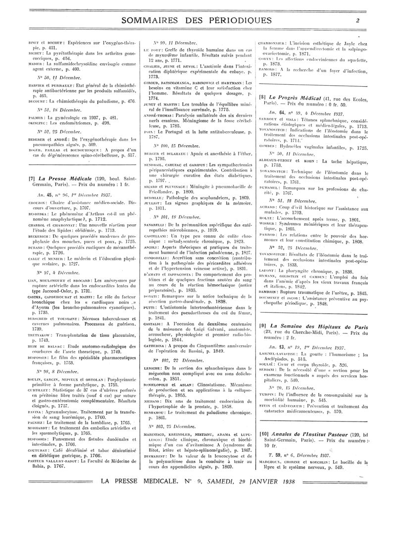 1938, Sommaires des périodiques. -