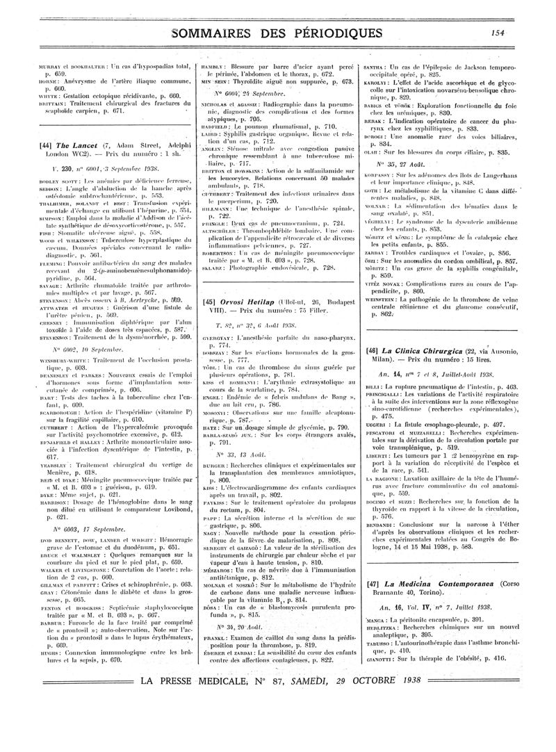 1938, Sommaires des périodiques. -