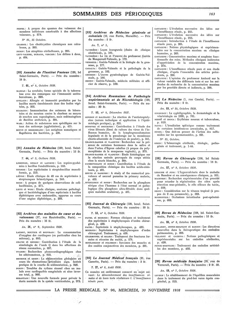 1938, Sommaires des périodiques. -