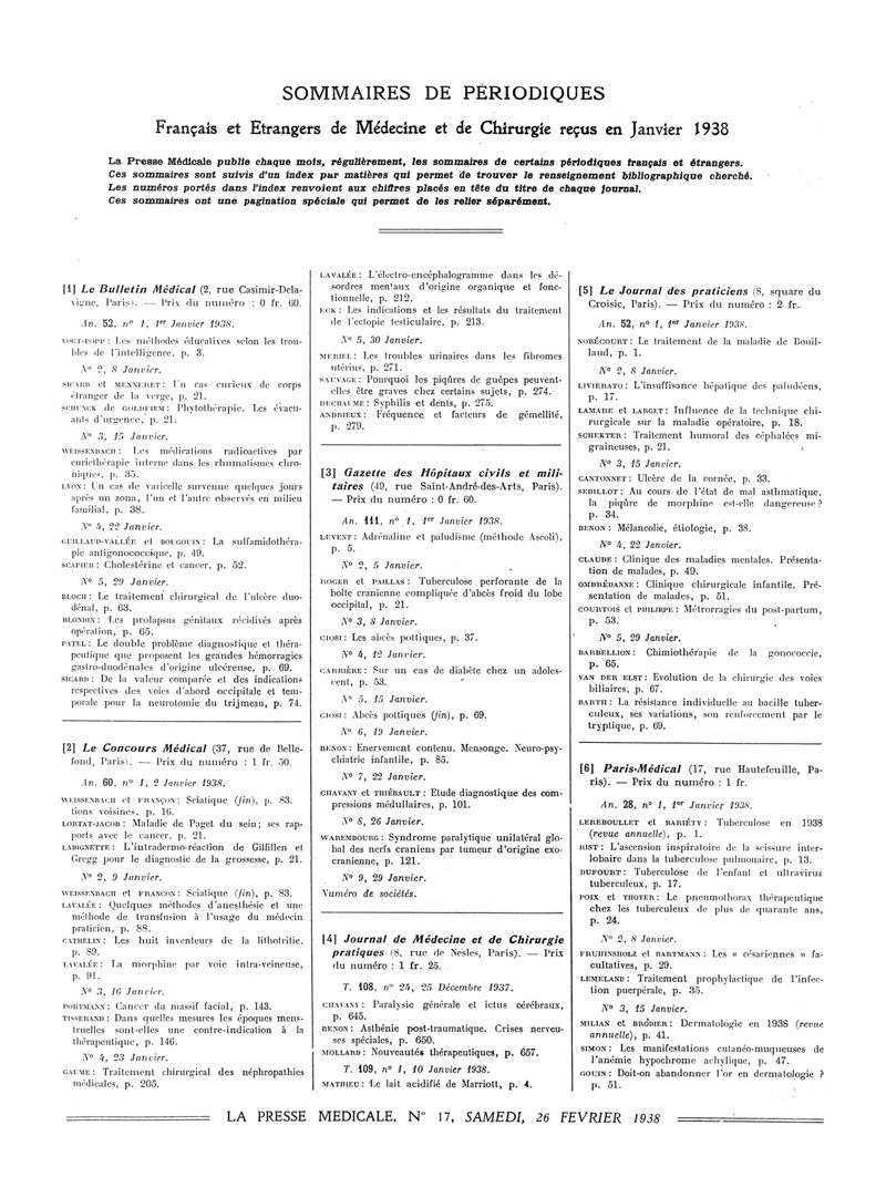 1938, Sommaires des périodiques. -