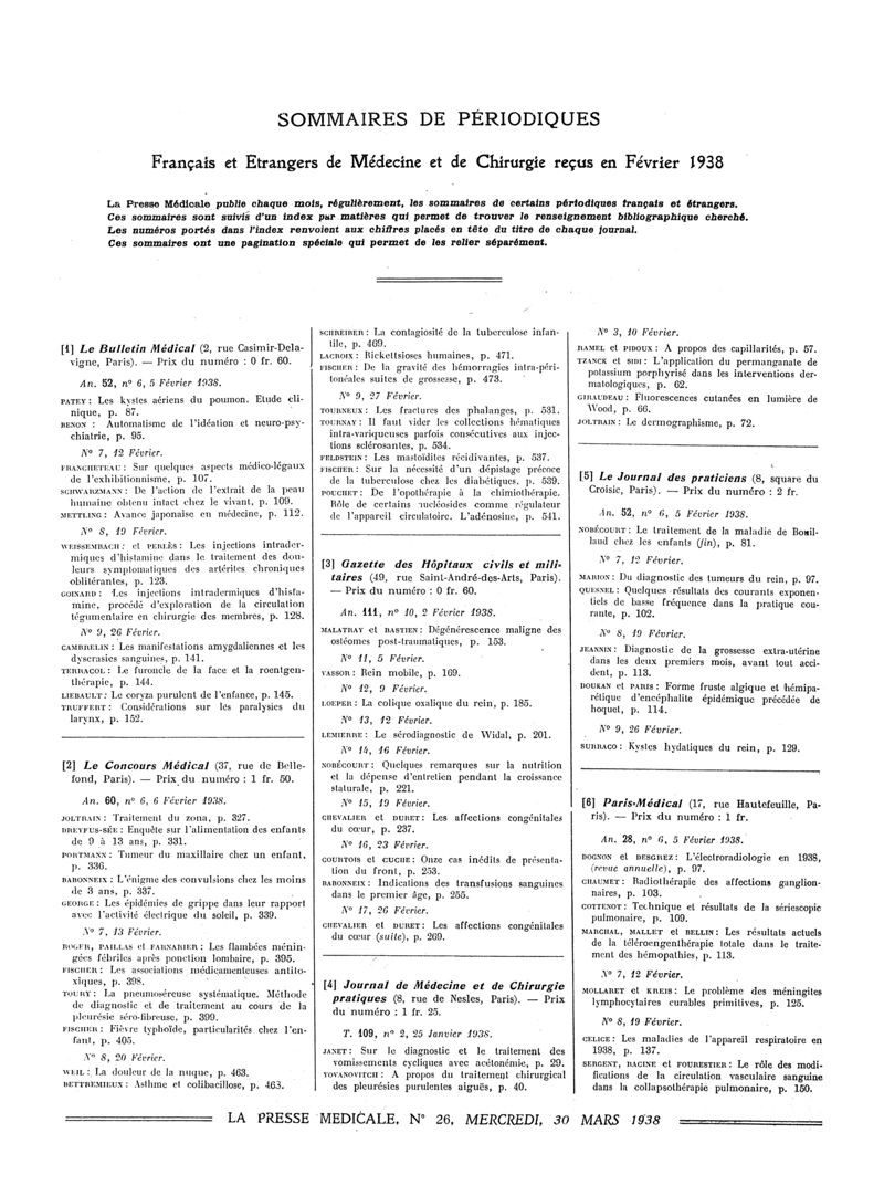 1938, Sommaires des périodiques. -