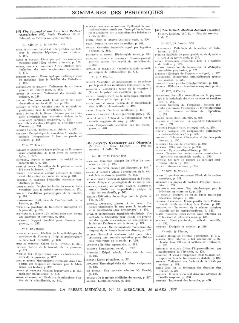 1938, Sommaires des périodiques. -