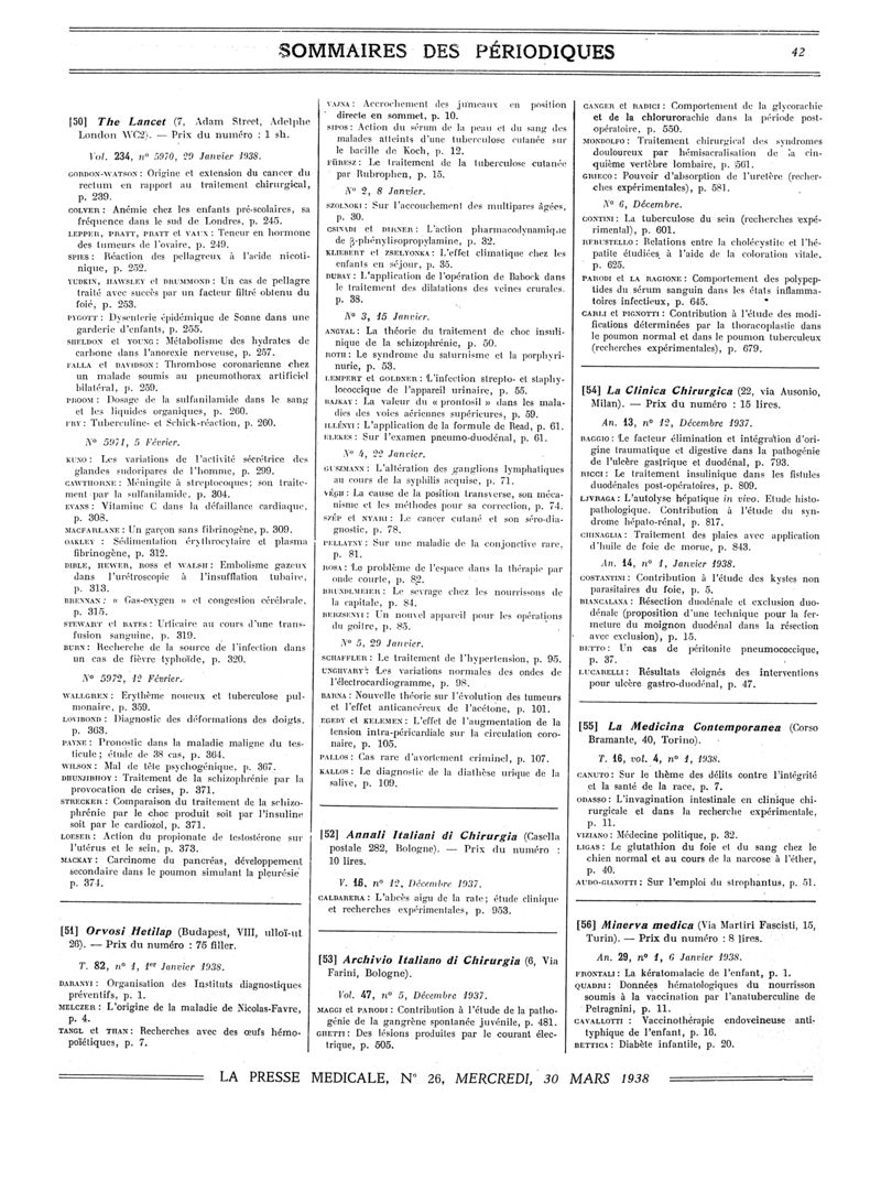 1938, Sommaires des périodiques. -