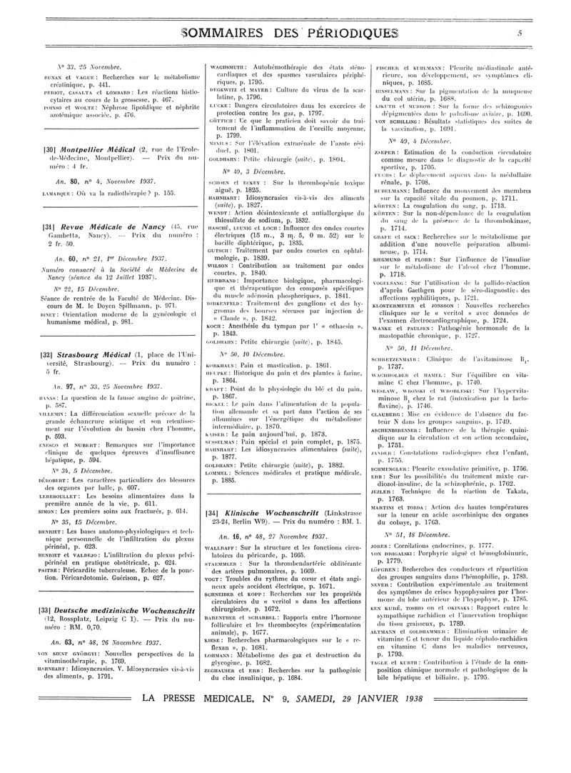 1938, Sommaires des périodiques. -